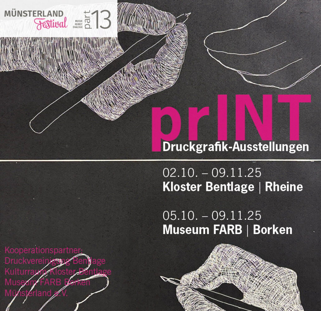 Seit mehr als 25 JAHREN, nämlich seit 1998, gibt es die Druckvereinigung Bentlage. Wir haben uns die Förderung der Druckgrafik und Buchkunst sowie die Vermittlung traditioneller als auch experimenteller Drucktechniken zur Aufgabe gemacht und betreiben auf dem Gelände des Klosters Bentlage in Rheine zwei gut ausgestattete Werkstätten.