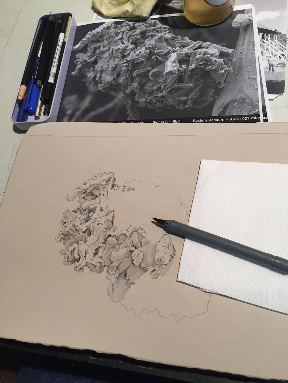 I am currently collaborating with scientists at the National History Museum, London on a project that uses an electron microscope to examine dust gathered from my fathers childhood home in Hamburg, Germany, a city heavily bombed during World War II. This body of research examines how drawings of dust allow us to consider materiality, history and time through imagery manifested through the lens of science and through processes of drawing.