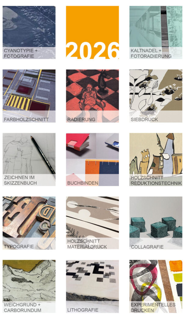 Das Workshop-Angebot umfasst den Bereich der künstlerischen Druckgrafik, die Buchkunst, sowie die Arbeit mit Papier an sich, und wird erweitert durch Zeichnung und Fotografie.